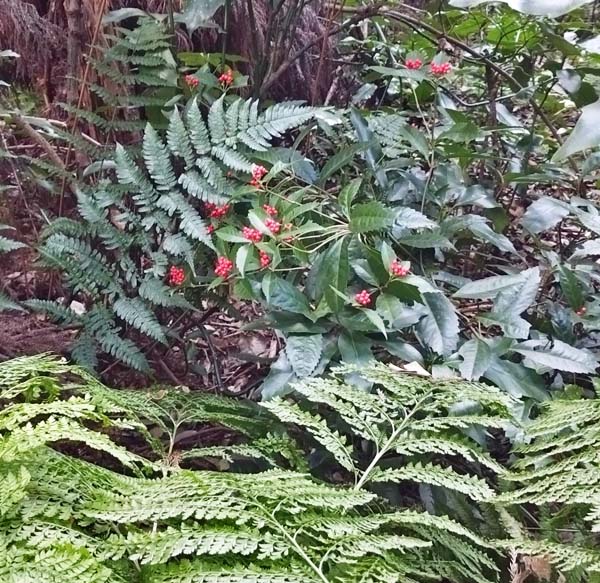 やぶに囲まれながらもたくましく実をつけたセンリョウは