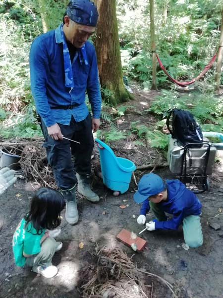 火起こしのために杉の木の葉を拾う→土を掘り起こす→火を起こす→