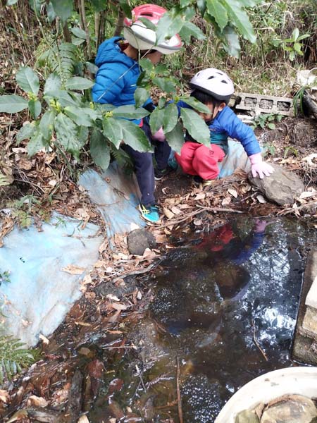子ども達は少し欲しいと。。。池の浅瀬に入り込み卵にさわる。